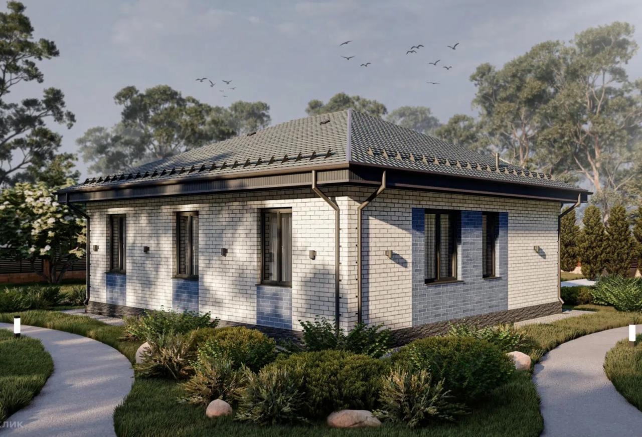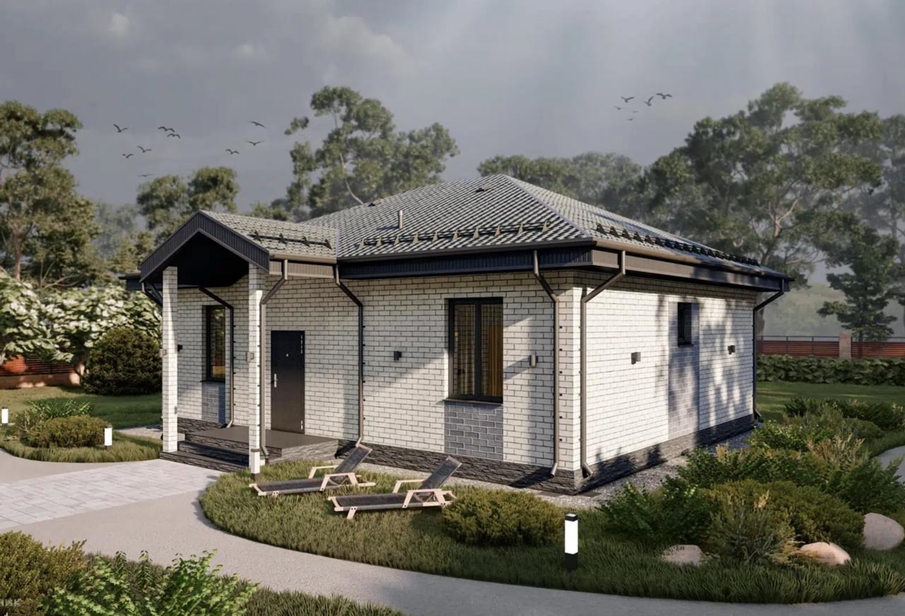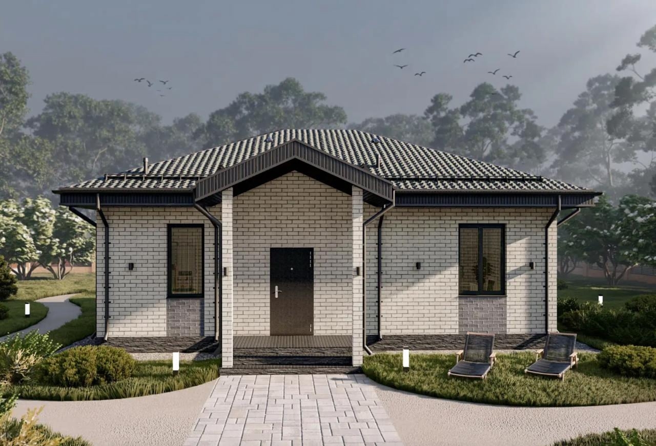 Для тех, кто ценит основательность и не гонится за мимолетной модой. СП-90 — это классический одноэтажный дом, который выглядит как настоящая семейная усадьба. Благородный кирпичный фасад и надежная четырехскатная крыша создают ощущение защищенности и долговечности.