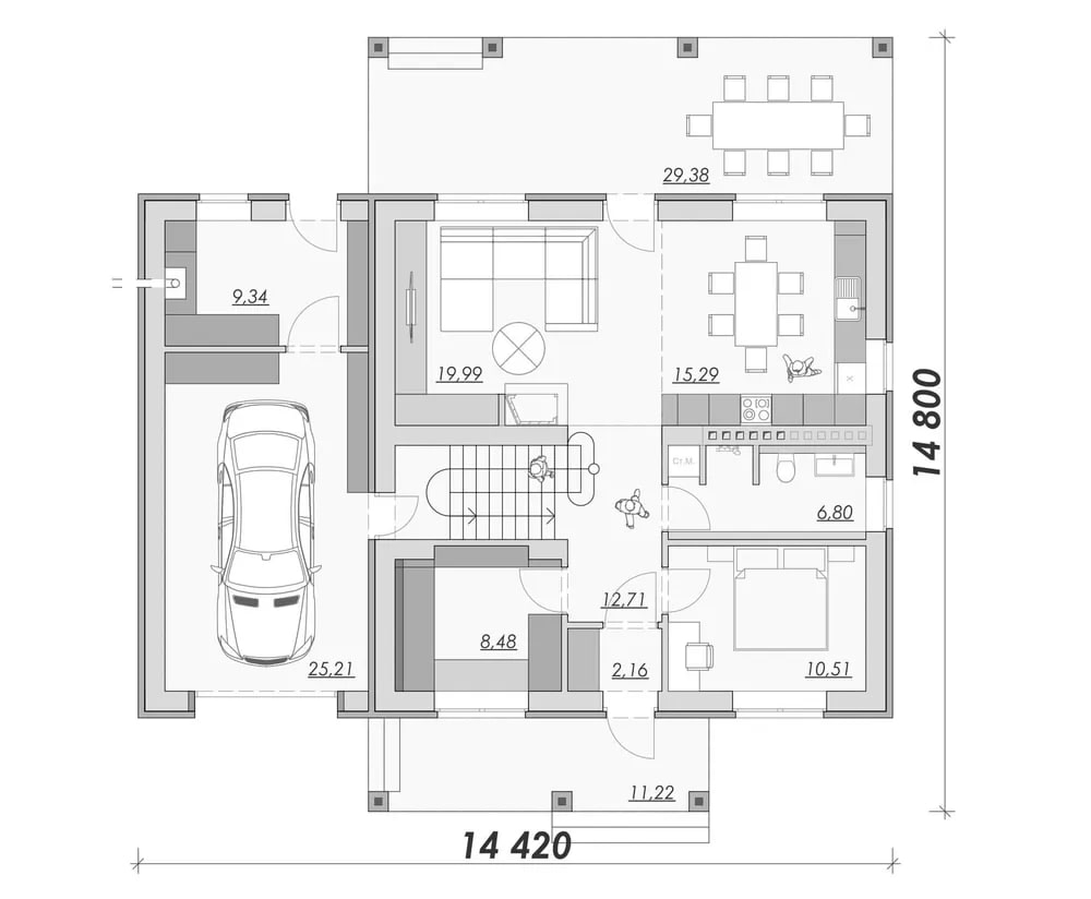 Удобство одного этажа. Вся жизнь проходит на одном уровне — без неудобных лестниц, что делает дом безопасным для детей и комфортным для всех членов семьи.