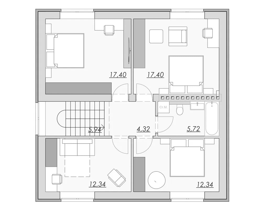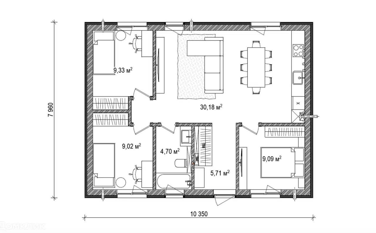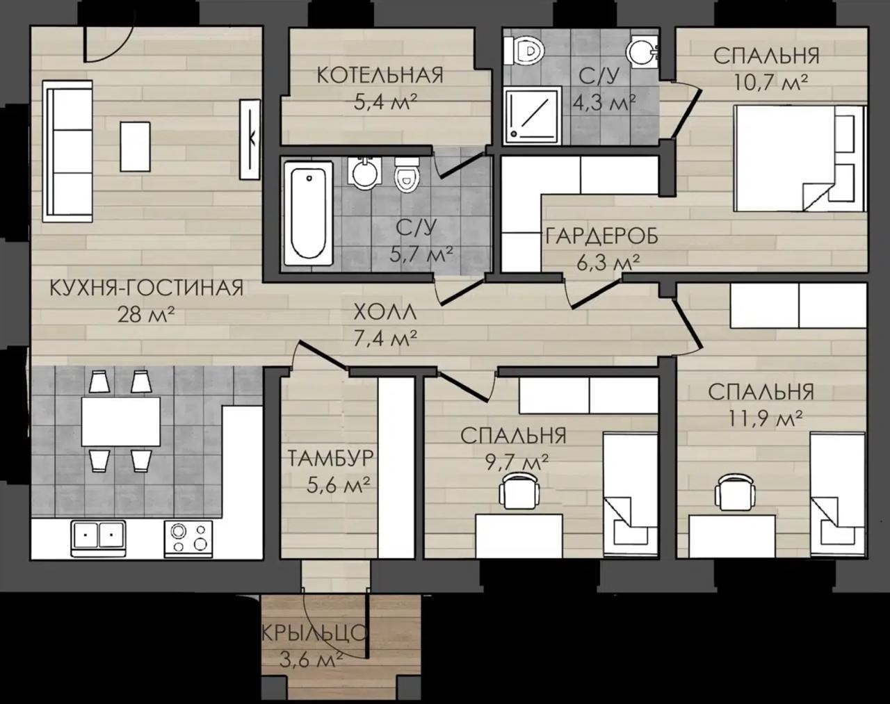 Продуманная планировка. Проект включает всё необходимое для комфортной жизни: несколько спален, санузлы и просторную общую зону.