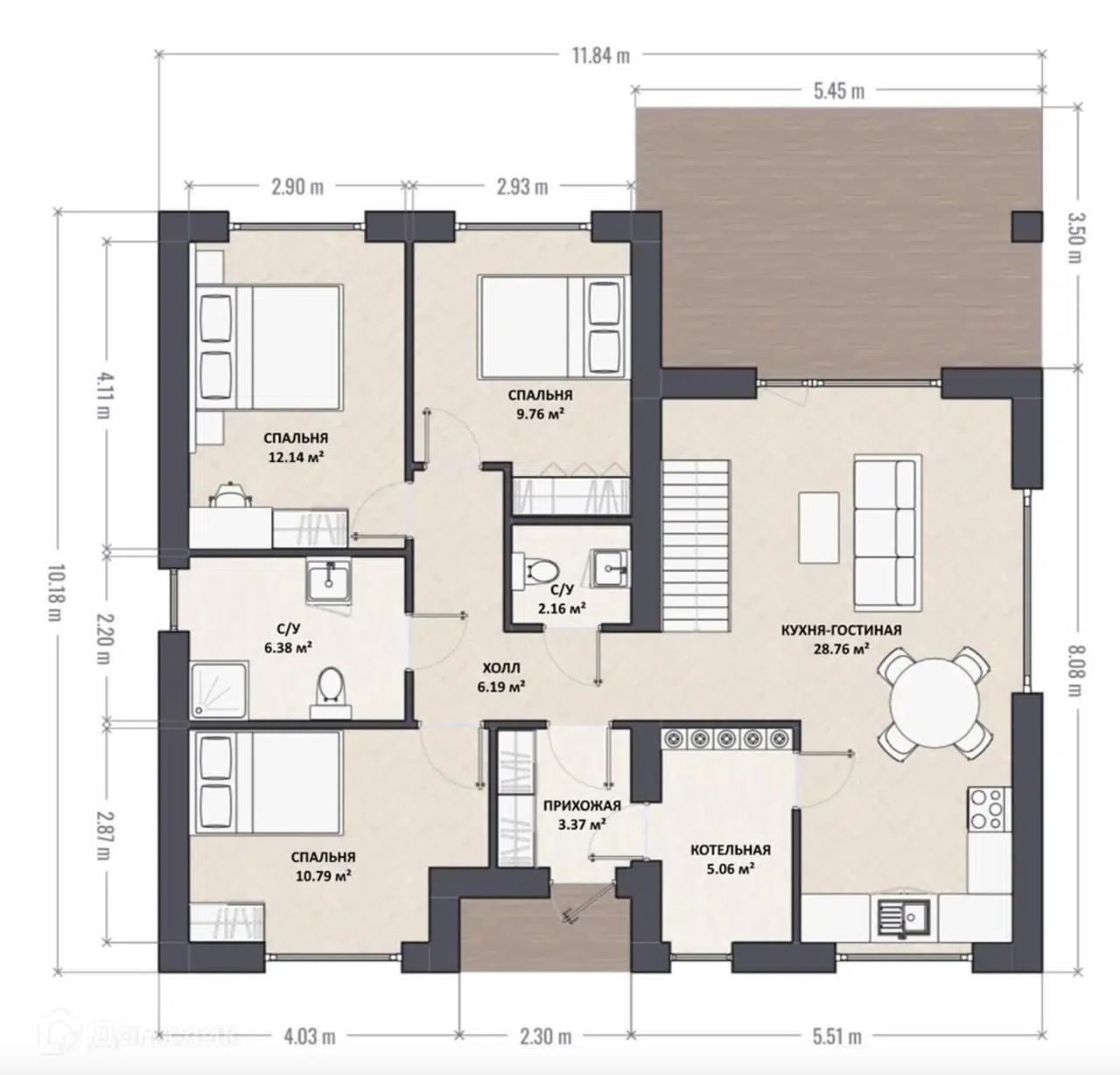 Максимум удобства: Главное преимущество проекта — два полноценных санузла! Это уровень комфорта, который редко встречается в домах до 100 м². Забудьте об утренних очередях — один санузел для хозяев, второй для детей и гостей.