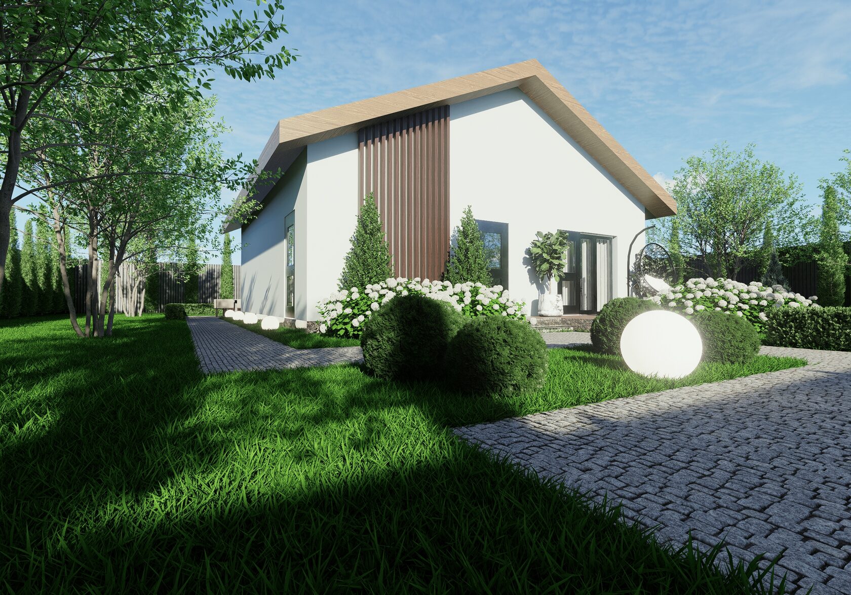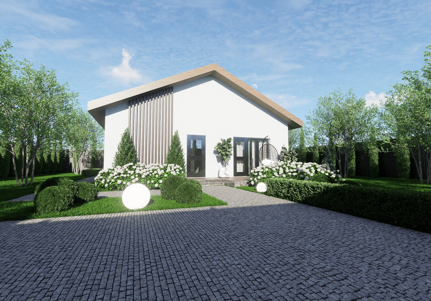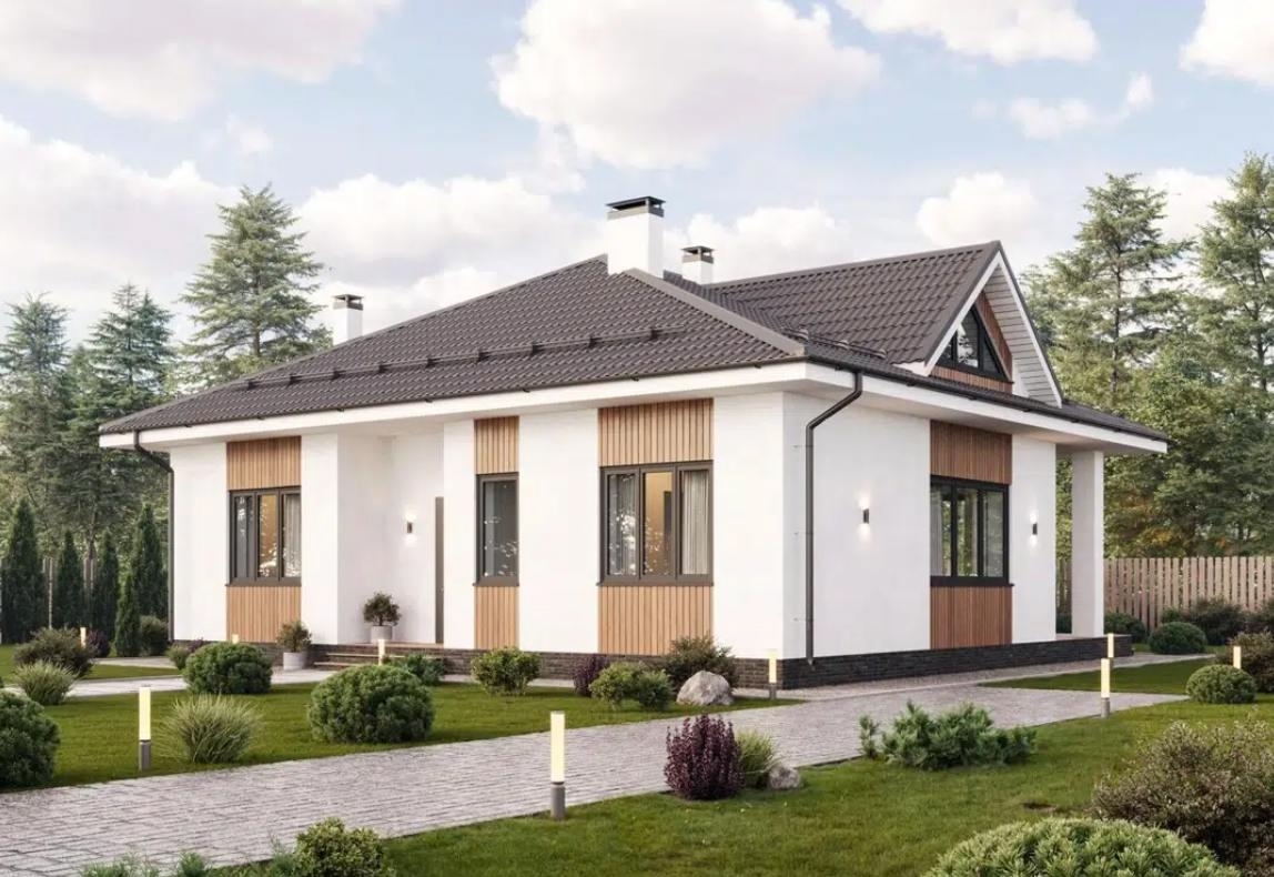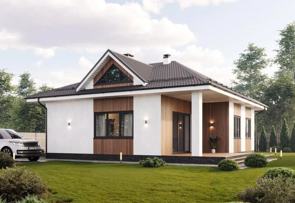 Стильный фасад: Сочетание белой штукатурки и дерева — это современная классика, которая выглядит дорого и всегда актуальна.