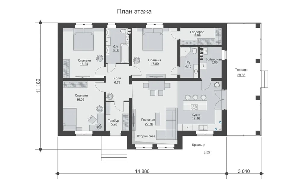 Удобство одного этажа: Отсутствие лестниц делает дом безопасным для детей и пожилых родителей, а также удобным для повседневной жизни.